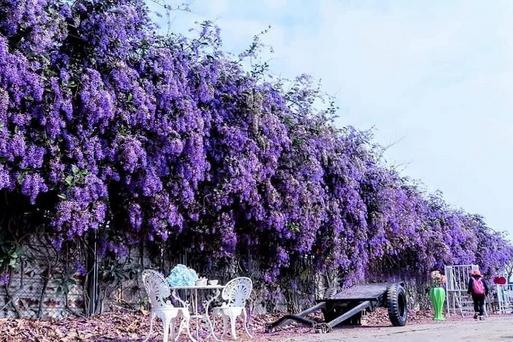 長春園藝孤挺花園有全台最高的錫葉藤花牆,花期落在每年2至4月,滿版錫葉藤花牆大景,最高最繽紛的紫色花牆,絕美的拍攝場景,是你不可錯過的美照打卡景點,園區內還有可愛動物等裝置藝術可打卡,讓人宛如置身童話場景的長頸鹿造景,花田間也擺放了機車及庭院座椅,一旁的純白梯架更是必打卡亮點之一。