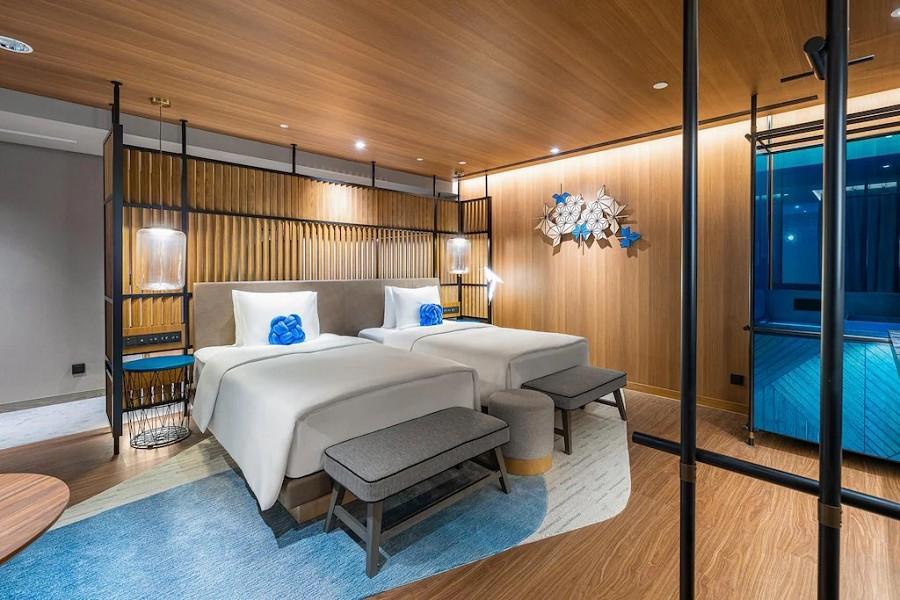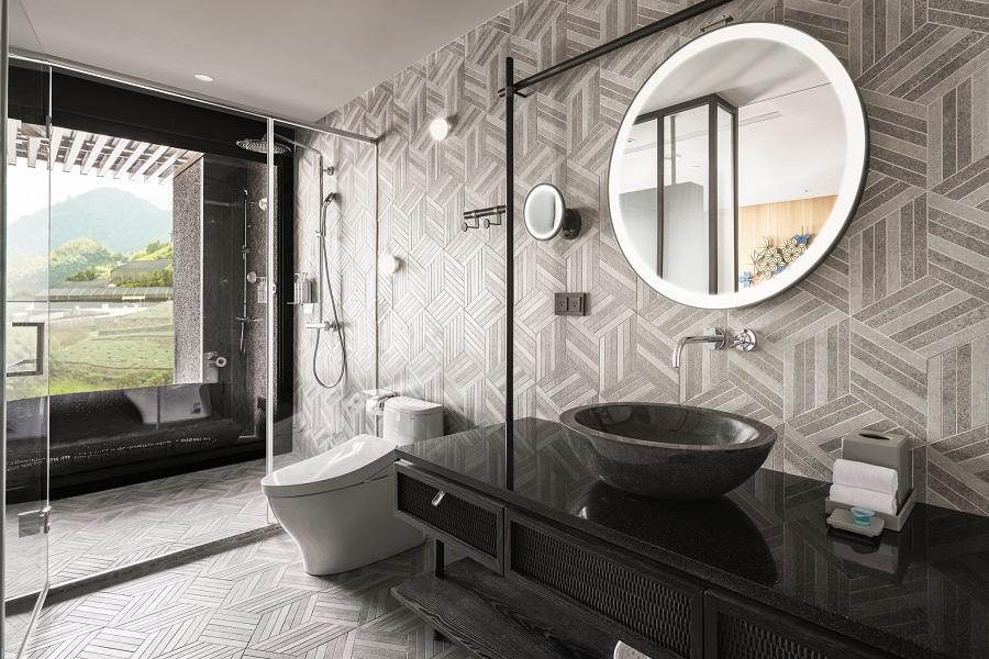 客房以鄒族文化與台灣藍鵲為設計謬思,床頭的楓葉飾板、雲海/編織地毯、獵人風迷你吧櫃子都以紅、藍色設計,營造出兩種不同的客房視覺;翱翔在走廊中指引進入客房的台灣藍鵲,也化身為床頭夜燈,守護著旅人睡眠,將阿里山鄰間文化體現在整體設計中。浴室空間融入了編織紋理,並把螢火蟲意象點綴在牆上,突顯阿里山擁有乾淨的空氣、森林與水源。