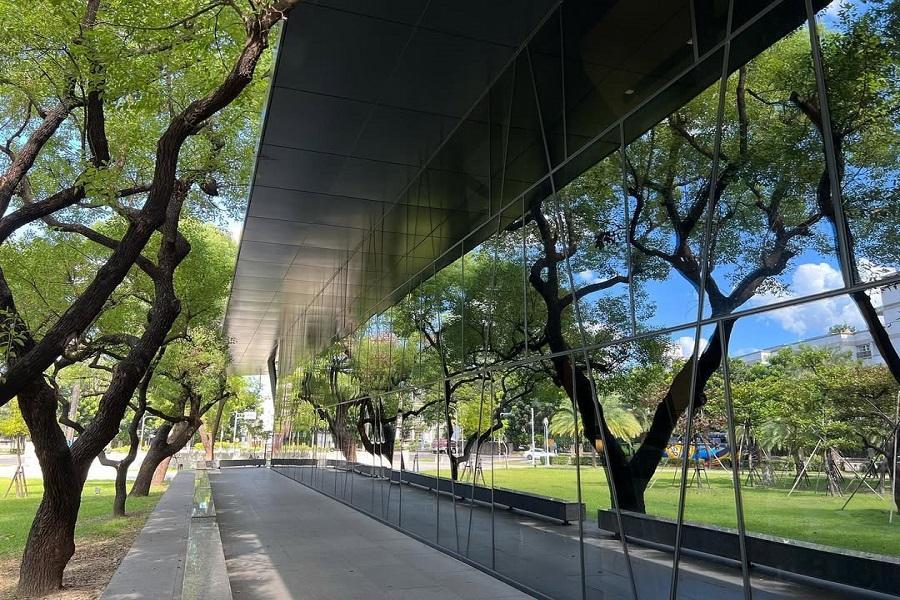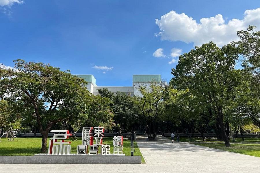 屏東縣立圖書館總館位於屏東市千禧公園內,萬年溪水環繞,綠意盎然,園區範圍接近5公頃,是全台唯一的森林系圖書館,109年整建後重新啟用。總館位於千禧公園內,原有的老樟樹林被刻意保留,並且建築設計將室外的樹影、綠意引入室內,呈現「置身森林中的圖書館」感受。外牆玻璃大量反射與穿透性設計,使圖書館與環境相互呼應。照片來源IG@12mli12提供