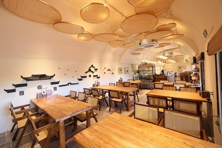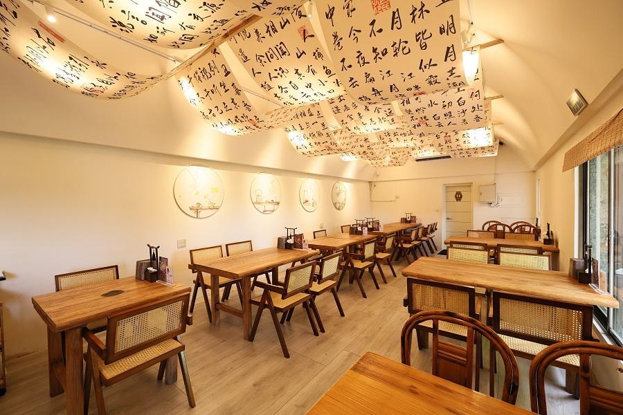 中式風格庭院景觀餐廳,庭院造景非常的古色古香很有時代穿越感,有小橋、流水還有瓦片屋頂花園和高掛的燈籠,特別打造了屋頂花園可以走上去坐在屋簷旁拍照。餐點以新中式料理為主,有火鍋、烤魚、中式茶飲還有特別的圍爐烤茶,甜點有冰品、豆花和飲料等選擇~不同於傳統的中式餐點。