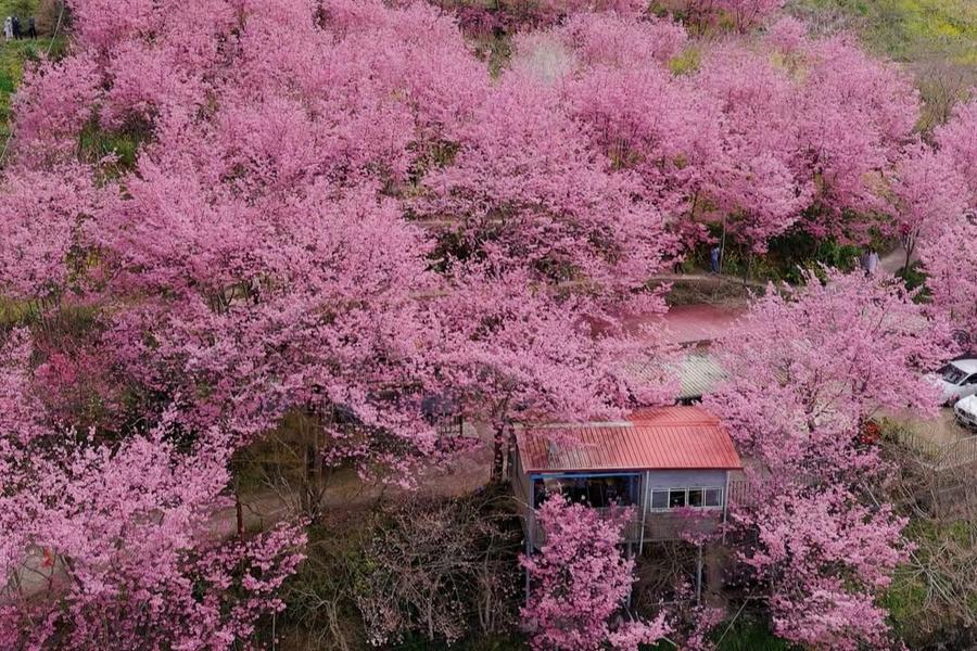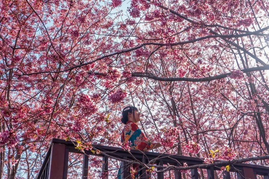 坐落於尖石山城的財伯觀光果園,每到二月下旬至三月,便迎來一年中最浪漫的時刻。數百株富士櫻依山綻放,將果園染成一片粉紅詩境。拾級而上,兩旁櫻花枝椏交織,花瓣輕落如雨,漫步其間,彷彿走進春天鋪展的花廊。財伯以三十年心血守護這片土地,將果園化為山間秘境,免費開放遊人入園,只盼更多人能共享這份花海的喜悅。微風輕拂,櫻瓣隨風飛舞,時而落在肩頭,時而鋪滿小徑,彷彿一場不期而遇的櫻花雨。