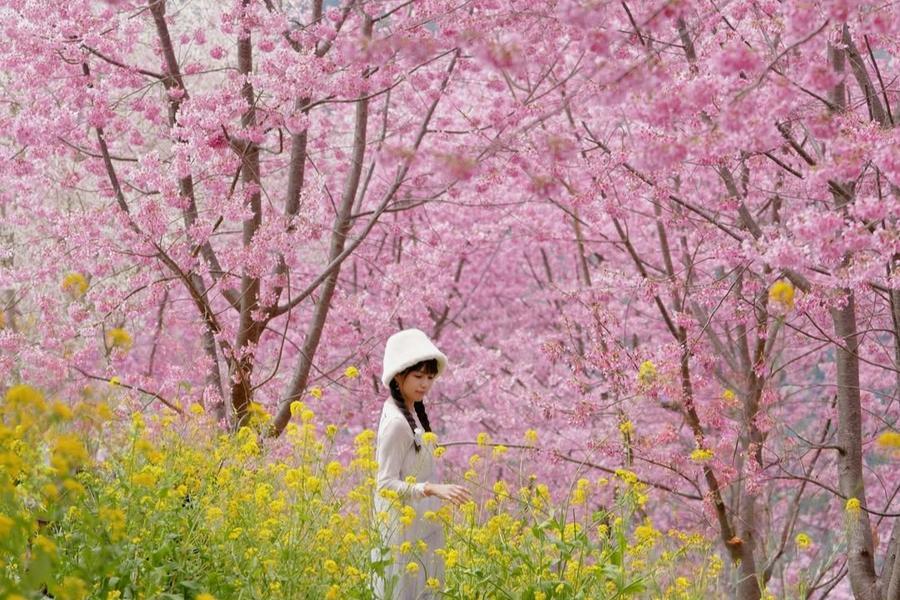 財伯觀光果園以八重櫻為主,沿著小山坡層層種植,與地面黃澄澄的油菜花相互映襯,形成櫻花與油菜花同框的絕美畫面。每一個角落都像精心布置的拍照景點,讓人忍不住停下腳步留影。