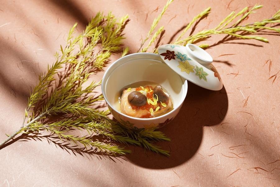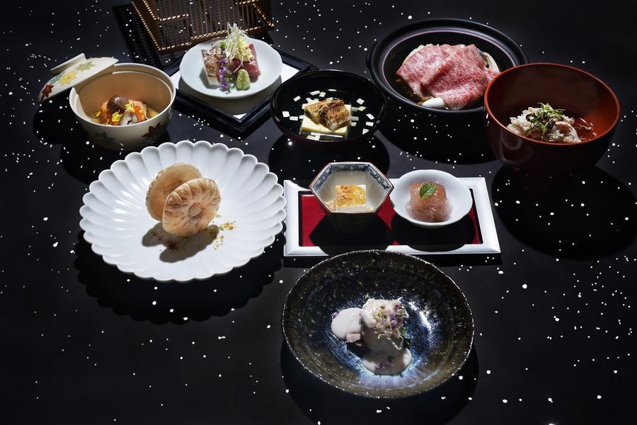 秋意輕落北投,在這金風送爽之時,日勝生加賀屋天翔廳以「星月夜」開席。靈感取自秋季清澈的夜色,乾爽而潔淨的天幕滿佈繁星,化作盤中的微光與層次。料理長林田昌人擷取秋之山海精華,海中秋蟹的清甜,陸地玉露鴨的脂香,山林菇類的醇厚,讓季節於味蕾間從容更替。視覺定調回應豐收意象,黃與紅承接楓秋的溫度,白則象徵夜空星光,三色相襯,勾勒出一道道清爽、沉穩又不失層次的秋日輪廓。