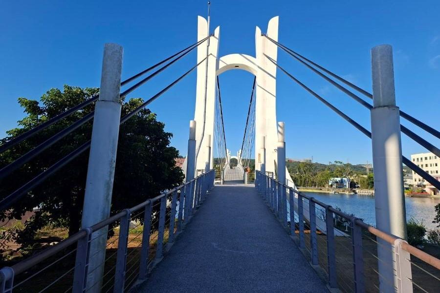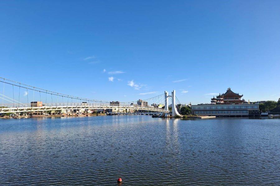 龍潭大池吊橋是長約 132 公尺、結合斜張與吊橋結構的白色跨湖人行橋。白天橫跨碧波湖面,夜間搭配彩燈變化,浪漫又壯觀,是龍潭大池最醒目的地標之一。