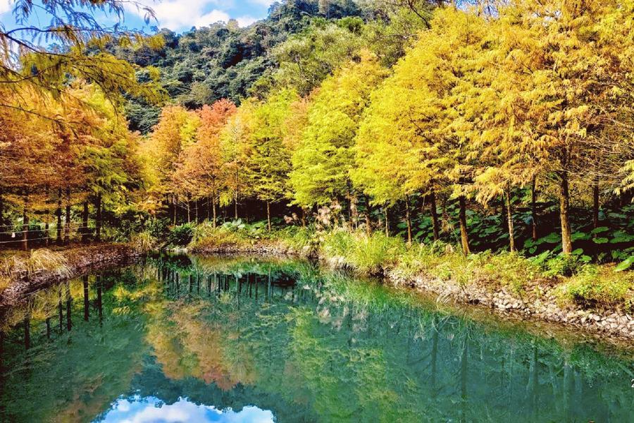 位於宜蘭礁溪二結與員山枕山交界處的 「三層坪農塘」,是全台首創的階梯式農塘,由農委會水保局整合周邊私有土地打造而成。偌大的山林環境幽靜宜人,宛如走入屏息的仙境秘境。園區以地形高低差打造九層式堆疊農塘,清澈翠綠的流水層層 ,如階梯瀑布般壯觀療癒,成為遊客必拍的視覺亮點。沿途可欣賞 茂密落羽松林、小橋流水、溪流潺潺、黃楓轉色 等豐富景緻,站上拱橋眺望金黃落羽松倒映湖面,更是如油畫般夢幻。