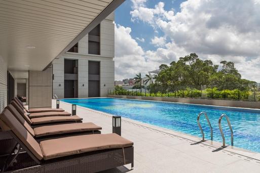 泳池是位於館內二樓戶外的常溫泳池,空間寬敞開闊,四周綠意盎然,還可看見司法博物館、美術館等無敵景觀,旅客於此能盡情享受悠閒氛圍,是台南堪稱指標的泳池飯店。