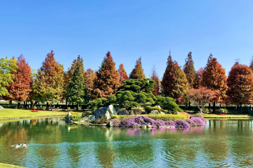 由日本庭師規劃的禪風「迴遊式庭園」遍植百年松樹、真柏、茄苳、桂花、七里香、紫薇花等珍稀樹種,且有著五大看點「天然畫框、白砂青松庭、枯山水景、瀑布池庭、百年成美公堂」,其中 #日本黑松 220歲、#楓港柿 550歲,為鎮園之寶;最受矚目的季節性景致為:3-5月許願藤/花旗木花季、6-9月紫薇花季、11-2月的落羽松季。
