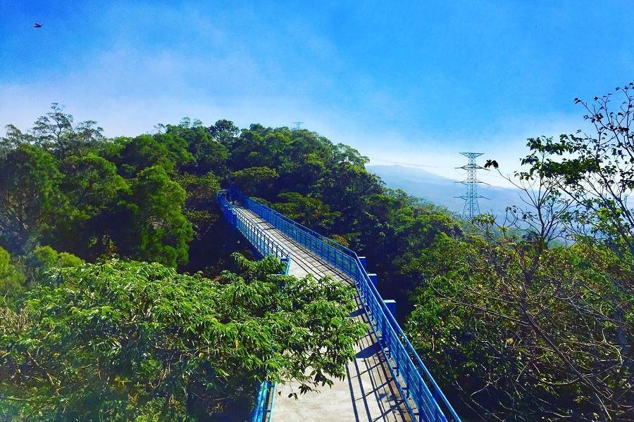 天空藍的橋身架高與樹冠平行,站在橋上可欣賞茶園風光與平原景緻,尤其桐花季時,可近距離欣賞桐花,登上景觀台,更可眺望遠方滿坑滿谷的桐花,山頭被桐花覆蓋成白皚一片,美麗極了,天氣好時更可遠眺通霄、苑裡沿海盡覽海岸風貌。不遠處又銜接著天空之橋,走在鋼索吊橋上,兩側均有美麗的風光,亦是不能錯過的拍照地點。
