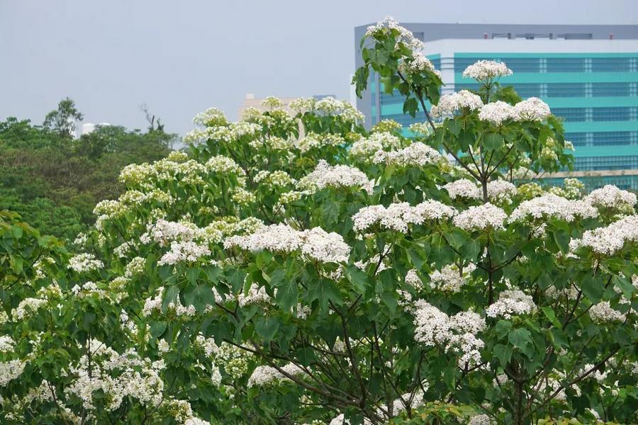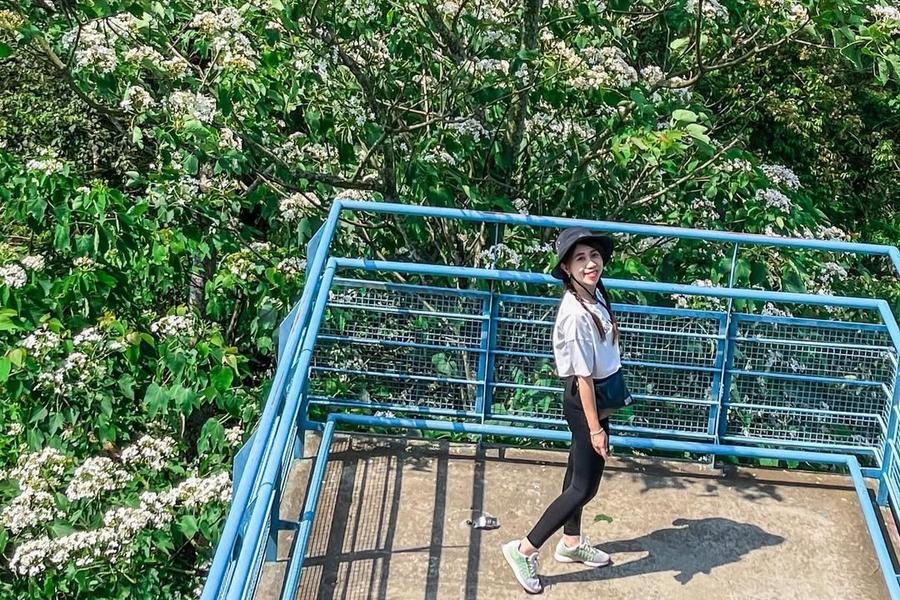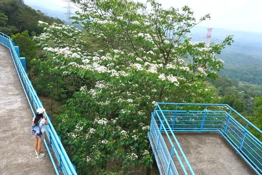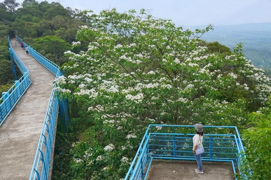 苗栗縣銅鑼鄉的九華山天空步道,每到油桐花季便換上最夢幻的模樣。滿山遍野的油桐花潔白盛放,花海層層鋪展,清新又雅緻。微風輕拂,花瓣如雪般紛紛飄落,彷彿下起一場浪漫的花雨。站上天空步道與觀景台,放眼望去,翠綠山巒與雪白桐花交織成一幅詩意畫面,一層又一層延伸到天際,靜謐又療癒,讓人不自覺沉醉其中,心也跟著慢慢放鬆。