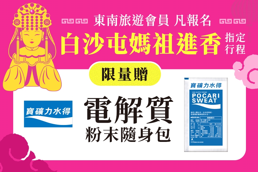 東南會員報名白沙屯指定 團體旅遊 一日遊 行程,參團旅客即享有寶礦力水得電解質粉末隨身包乙份。(數量有限,送完為止)
