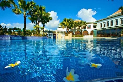 都寬敞的中庭戶外游泳池-共有五大主題泳池,引進來自中央山脈、海岸山脈匯集而成的天然泉水,熱帶棕櫚樹及紅花點綴其中,展現濃濃的南洋度假風情。