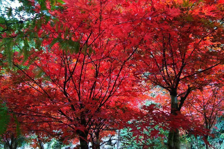 每逢10月下旬至11月正是楓紅時節,杉林溪園區栽培楓葉品種:青楓3000棵、紫葉槭800棵、楓香500棵等。當地日夜溫差大,園區內紫葉槭一進入11月就迅速轉為鮮紅色,搶先成為國內第一個賞楓景區。