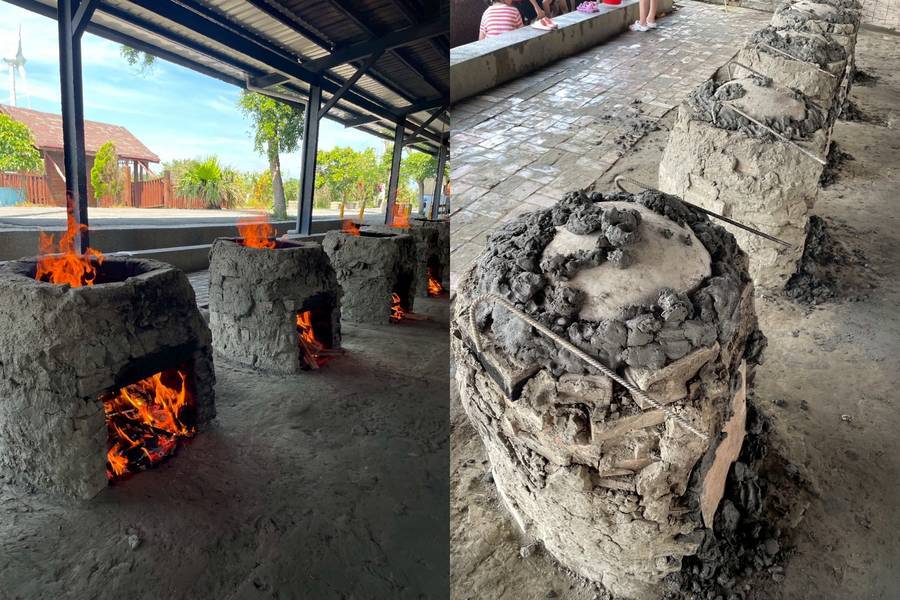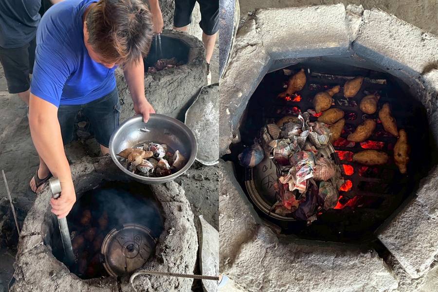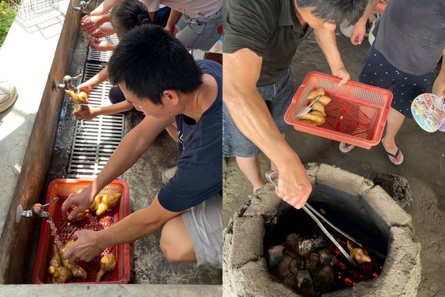 過程中約需1小時燒窯、2小時悶烤,等待的同時也能感受團隊合作的樂趣與期待。當開窯瞬間,熱氣與香氣撲鼻而來,雞腿、地瓜、雞蛋與香芋飯一一出爐,品嚐最純粹的古早風味,留下難忘的農村回憶。